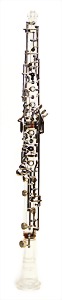 Oboe, aus Plexiglas, Konservatorium-System, Ringklappen vollautomatisch, 1937, 59 cm, Plexiglas Zust. 1, Mechanik Zust. 2-3, mit Etui #583#