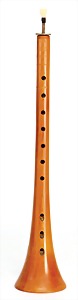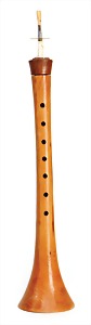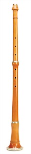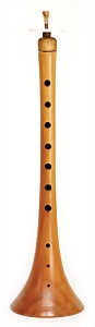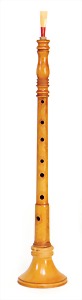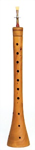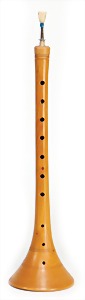 Jugoslawische Volksschalmei, Rozenice, sehr helles Holz, 50,6 cm, unsign., 6 Tonlöcher, Rohr wird im Schallbecher aufbewahrt, im Schallbecher dafür 1 Stöpsel aus Holz, 1970-1987, Zust. 1, ROZENICE, mit einer 2. Pirouette und Rohr #538#