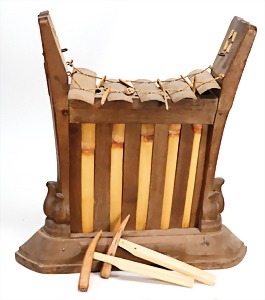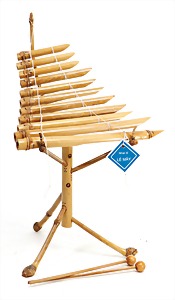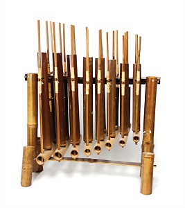 angklung "Batterie", from Bali rattle idiophone, in a bamboo frame, free-hanging bamboo canes in a bamboo grid, height: 63 cm #744#