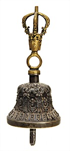 ritual bell, Tibet, handle made of brass, crowned head, bell: silver-bronze, with richly ornaments, head with massive signs of abrasion, 18 cm #425#