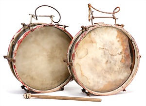 2 foot drums, with a diameter of : 32 cm, two-sided covered, 1 cover is missing, 1 cover is torn, 1 mallet, c. 1850