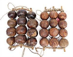 rattles, from Zambia, pair for fixing on the legs, with lacing, each rattle with 3 wood rods, each with 4 fruits in a row, fruits with rattles, height: 20 cm #647#