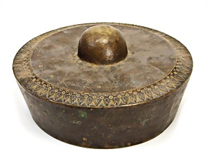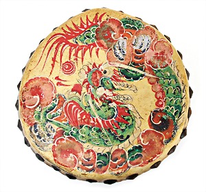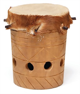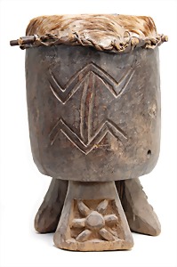 floor tom, 1 skin, with 3 feet, spidder motif, symbol of dignity, with dowels, Bamenda Grassfields, Kingdom of Bamum, with a diameter of 30 cm, 2 small patches with flaws in the skin #265a#