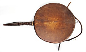 Shangka drum, Tibet, cover is made of yak leather, carvedhandle, with drumstick, c. 1880, with a diameter of 36 cm #85#