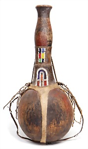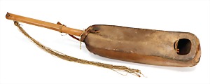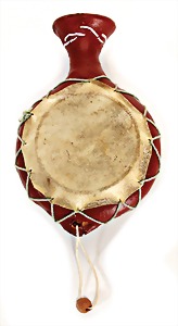 clapper drum, Tunisia, clay bottle with 2 turned up skins, in clay mallet on a cord, 14.5 cm #709#