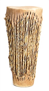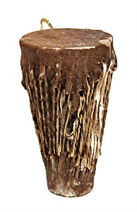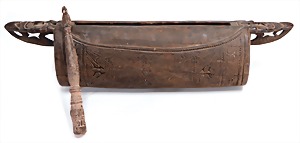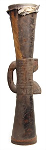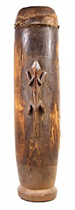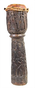 drum , signal drum, 1 skin, Bamenda Grassfields, probably from the Kingdom of Bamum, with carved lizard, around 1900, 1.11 m, small holes in the skin#265#