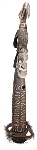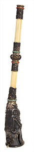 signal horn (transverse horn), New Guinea, Middle Sepik Mindibit, colored wood, ball on the head, ornaments down below, wooden twigs with ribbons inset feathers, navel was once broken, old repaired part, used , #259#