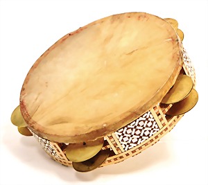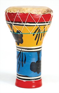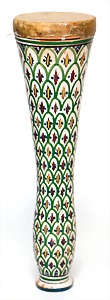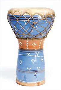 drum made of clay, white/brown/light blue enameled, covered with animal skin, 37.5 cm, probably Arabien #955#