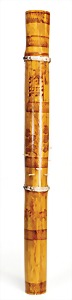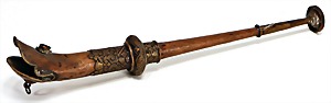 trumpet, Inner Mongolia, rolled silver, inset stones (some stones missing), intermediate parts are made of ivory, c. 1880, the ivory at the upper adapter is torn, 45 cm #251#
