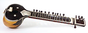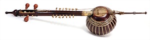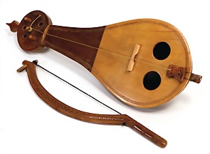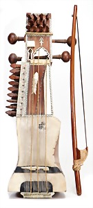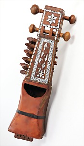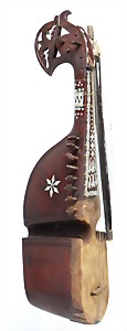 Kashmiri spike lute-bowed lute, with inlaid work, calabash body with glued on skin, iron spike, neck with turned top, 3 gut strings and 4 sympathetic strings, around 1900 #359#