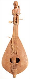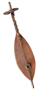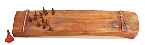 lute, Batak instrument, lake Toba, north Sumatra, probably around 1900, wood, with figure, 2 inserted silver coins (a third coin is missing), 2 strings, 69 cm #50#