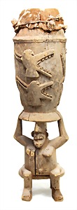 drum Senufo, Ivory Coast, 76 cm, carved wood, down below a figure, at the top 2 crocodile heads and bird figures, at the side woodworm damage, skin covered, cracks are caused of old age, used #472#