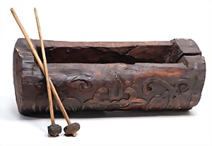 slit drum with drumstick, Garamut, Ramu river new Guinea, richly carved, 72 cm, with drumstick, c. 1880, with some cracks that are caused of old age #260#