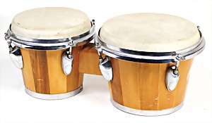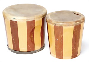 bongo drum, drum head was affixed on the sound box, made of agglutinated light and dark wood, with a diameter of 14.5 cm and 17 cm, with traces of usage, 1 drum with flaws #344a#