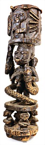 drum, probably Ghana, wood, complex carved, snake with a female. figure, covered with animal skin (with wooden lugs), 78 cm, used