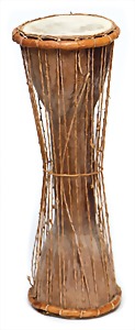 hourglass-drum, Kalungu, West Africa (Nigeria), talking cylinder, two heads, with rattling objects, is played with bent thighs, sounds can be changed by changing the tension of the leather straps, 46 cm #59#