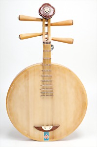 Yüehk'in, moon guitar (short-neck lute) with flat back, 10 frets, 2 pairs of silk strings, pegbox is morelike a Japanese yueqin, 62 cm, #608#