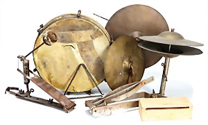 mixed lot, small cylinder, brass, 2 heads, 6 tension rods, flaws at one side, cymbal, 1 hand cymbal with leather loop, 2 cymbals in hi-hat, 1 cymbal on a tripod, with spring, bass drum pedal for the big drum, 1 wood block #344#