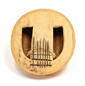 Sansa, with half calabash as resonating body, Africa, 8 metal tongues, 1 is missing, with a diameter of 27 cm #507#