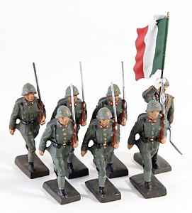 7 Figuren, marschierend, 7,5 cm, Zust. 1-2, 1 Fahnenträger, Zust. 2, mit italienischer Fahne