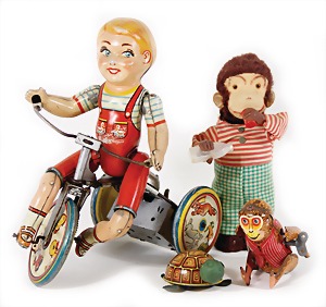 4 Teile Spielzeug, 2x Blech, Dreirad, Aufschrift Kiddy Cyclist, Uhrwerk intakt, bespielt, altersbed. Farbabplatzer, 1 x Affe, Made in China, turnend, Uhrwerk intakt, trinkender Affe, Papiermaché, Stoff u. Plüsch bezogen, Uhrwerk intakt, 17,5 cm, 1 x Lehmann Susi-Baby