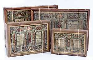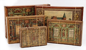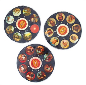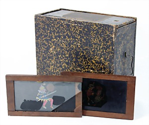 Laterna Magica, Orig.-Holzkiste, früh, gefüllt mit 15 bewegl. Bildern, Farbenrad, Fabeltiere, Figuren, Berufe, 17,5x10,3 cm, im Holzrahmen
