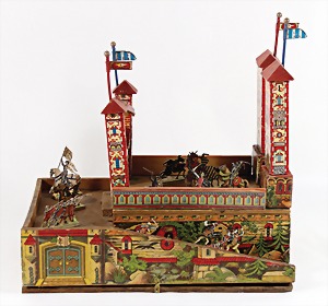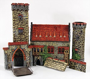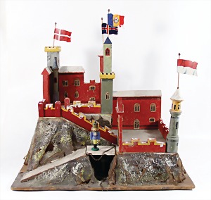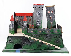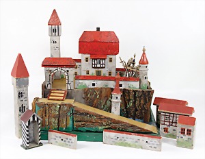 Ritterburg, Holz, Grundplatte: 49x32 cm, mit Holzbauteilen, Papier beklebt, einige Papier-Figuren, auf Vollständigkeit nicht geprüft
