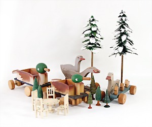 Fundkiste, 5 Luffa-Tannenbäume, 18-38 cm, einige holzgedrechselte Bäume (Erzgebirge), einige Teile Puppenstuben-Mobiliar, Holz, dazu 4 Nachzieh-Tiere, auf Holz-Rädern, 2 Enten, 2 Gänse, Alter?