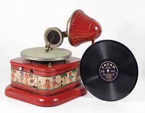 Kinder-Grammophon, Nerona, Uhrwerk intakt, Funktion nicht geprüft, mit Kurbel und jede Menge Platten, Grundplatte: 18x19 cm