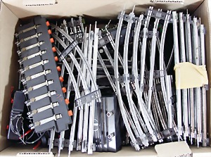 Gr. Konv. Fundkiste, Spur 0, Gleismaterial, meist Märklin, elektr. Ausführung, gerade, gebogen, Verteilerplatten, kl. Stücke, reichh., bitte besichtigen