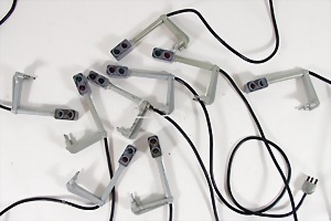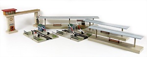 Konv. Eisenbahnzubehör, 2x Bahnübergang, 3x Bahnsteig, Blech L 28 cm, L:38 cm, mit elektrischen Anschlüssen, u.a.