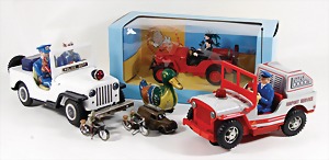 Fundkiste, Polizei-Geländewagen, Japan, 1 Hut fehlt, 1 Airport-Service, Batterieantrieb, Blech, 1 Geländewagen, Kunststoff, kl. Ente, Blech lithogr., Uhrwerk intakt, 2 Motorrad-Fahrer, 2. Weltkrieg, Masse, Kleinteile