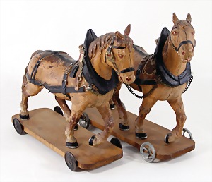 2-tlg., Masse-Zugpferd auf Holzbrett montiert, 1x Blech-Speichenräder, 1x Blech-Vollräder, L: 30 cm, teilw. altersbed. Spannungsrisse, Orig.-Zust.