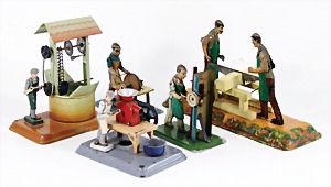 Konv. Dampfmaschinen-Antriebsmodelle, Bing, 2 Mann an der Säge, Blech lithogr., Sockel handlackiert, H: 15 cm, guter Zust., 1 Brunnen mit Schöpfrad, Fleischmann. 1 Mann an der Wurstmaschine, Fleischmann, Wurststreifen fehlt, 1 Mann an der Stanze, Lackfehler