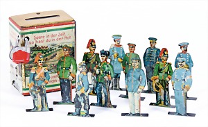 40 Blech Figuren, 6,5 cm, 1 Spardose, Blech lithogr., „Spare in der Zeit, dann hast du in der Not“