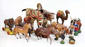 Konv. Blech-Spielzeug, darunter Höhenflugspiel, Flio, im Orig.-Kart., auf Vollständigkeit nicht geprüft, 1 Sparkasse, Guss, Aufschrift: Trick Dog, 1 Holz-Modell Aeroplan, einige Teile Zinn-Figuren, plastisch und halbplastisch, Schützen und Damen, 1 Masse-Pferd auf Zinn-Rädern, mit Guss-Figur (Napoleon), einige Guss-Bauernhof-Tiere, u.a.