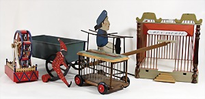 Kl. Menagerie Wagen, Holz, 30-50er Jahre, 1 Gehege-Teil neuer, 1 Bollerwagen, schwere Blechausführung, Guss-Eisenräder, Riesenrad mit Spieldose, Erzgebirge, Holz, 20 cm, 1 Reck-Turner Blech, 1 Reck-Turner Harlekin, ohne Sockel