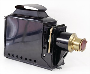 Laterna Magica, 30,5 cm, Blech, handlackiert, auf Holzsockel montiert, ohne Brenner