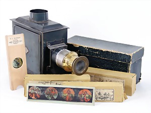 Laterna Magica, Blech, ohne Schornstein und Brenner, L: 25 cm, eine grosse Anzahl Glasplatten, ganze Serien, einige bewegl. Bilder
