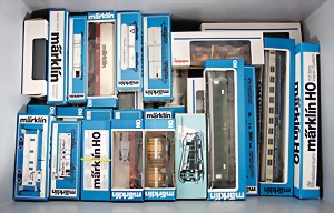 Konv. ca. 30-tlg., H0, diverse Güterwagen, Kesselwagen, Wasserwagen, Großgüterwagen, Personenwagen, alle im Orig.-Kart., neuw. Zust.