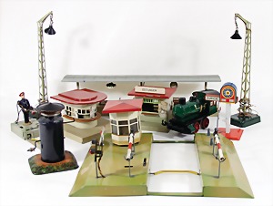 Konv. Eisenbahnzubehör, darunter Bahnsteig, Blech, L: 39 cm, 1 Bahnübergang, Läutewerk, Bahnwärter mit Signal, 1 Bing-Lok, Uhrwerk intakt, kompl. übermalt, 1 Richtungsanzeiger, 2 Lampen, 2 Zeitungskioske von Kibri