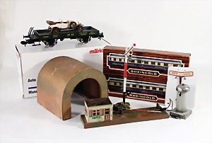 Fundkiste Eisenbahn, darunter einige Wagons der Firma Liliput, Spur H0, Bahnübergang, Blech, mit Bahnwärter-Häuschen, Dach fehlt, 1 Läutewerk, 1 Signal, Märklin, 1 Papiermaché-Tunnel, mit Märklin Wagon Nr. 4075, dazu 1 Museumswagen 1993, Märklin, Auto und Technik Museum Sinsheim, Nr. 80013