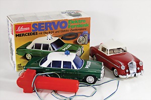 2x PKW, 1x Mercedes, mit Blaulicht, Elektro-Fernlenkauto, im Orig.-Kart., stärker bespielt, auf Funktion nicht überprüft, 1x Schuco Rollfix 1085, Replica, made in China