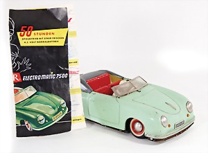 Electromatic 500, stark bespielt, Farbabplatzer und Roststellen, Boden löst sich etwas, dazu Gebrauchsanweisung, Distler Porsche