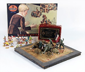 Konv. 11 Kunststofffiguren, Firma Merten, Nr. 514, Germany, ca. 4 cm, dazu 1 Diorama mit Kunststoff –Soldaten, 1 Blech-Kanone und 1 Katalog der Firma Hausser Elastolin Germany, 1935/36