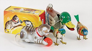 4 Teile Blechspielzeug, darunter Köhler Katze im Orig.-Kart., 1 Ente, 2 Köhler Vögel, Uhrwerk intakt