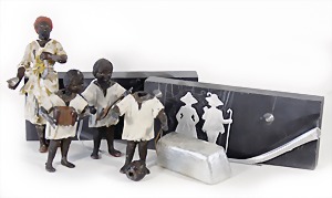 4 Teile Guss-Figuren, mit bewegl. Köpfen, 1 Kopf lose, 3 schwarze Musiker, 1 Mann mit Turban, altersbed. Farbabrieb, Figuren 12 – 17 cm, dazu 1 Zinn-Gussform, Motiv: Paar in Tracht, 1 Zinn-Barren, ca. 600 Gr.