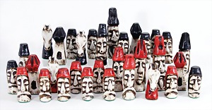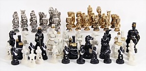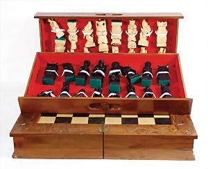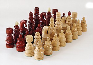 Schachspiel, Nachbildung des ältesten Indischen Schachspiels, Figuren ohne Brett, Figurenhöhe 8-13 cm, Holz bemalt