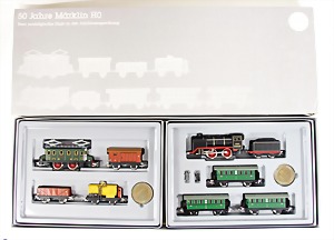 H0, 50 Jahre Märklin H0, 2 nostalgische Züge der Jubiläumspackung 0050, neuw., Orig.-Kart., mit Zertifikat, Karton außen etw. verschlissen