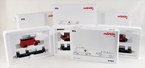 Konv. 4-tlg., H0, Schwerlastwagen mit Flugfeldfeuerwehr, Artikelnr.: 48667, Schwerlastflachwagen mit Bergkran, Artikelnr.: 48671, Schwerlastflachwagen mit Feuerwehrgerätewagen, Artikelnr.: 48755, Wagenset Brennstoff, Artikelnr.: 47903, alle im Orig.-Kart., neuw. Zust.
